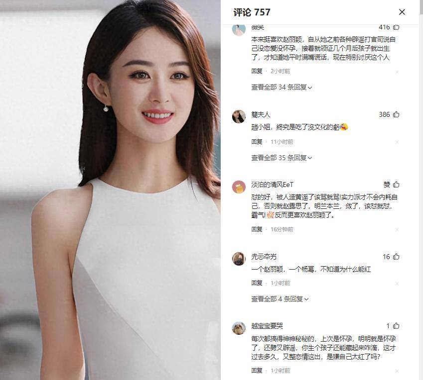 去年绯闻最盛时,她在微博带话题“赵丽颖这算官宣恋情吗”,评论区回怼三个字:“算你妹。”